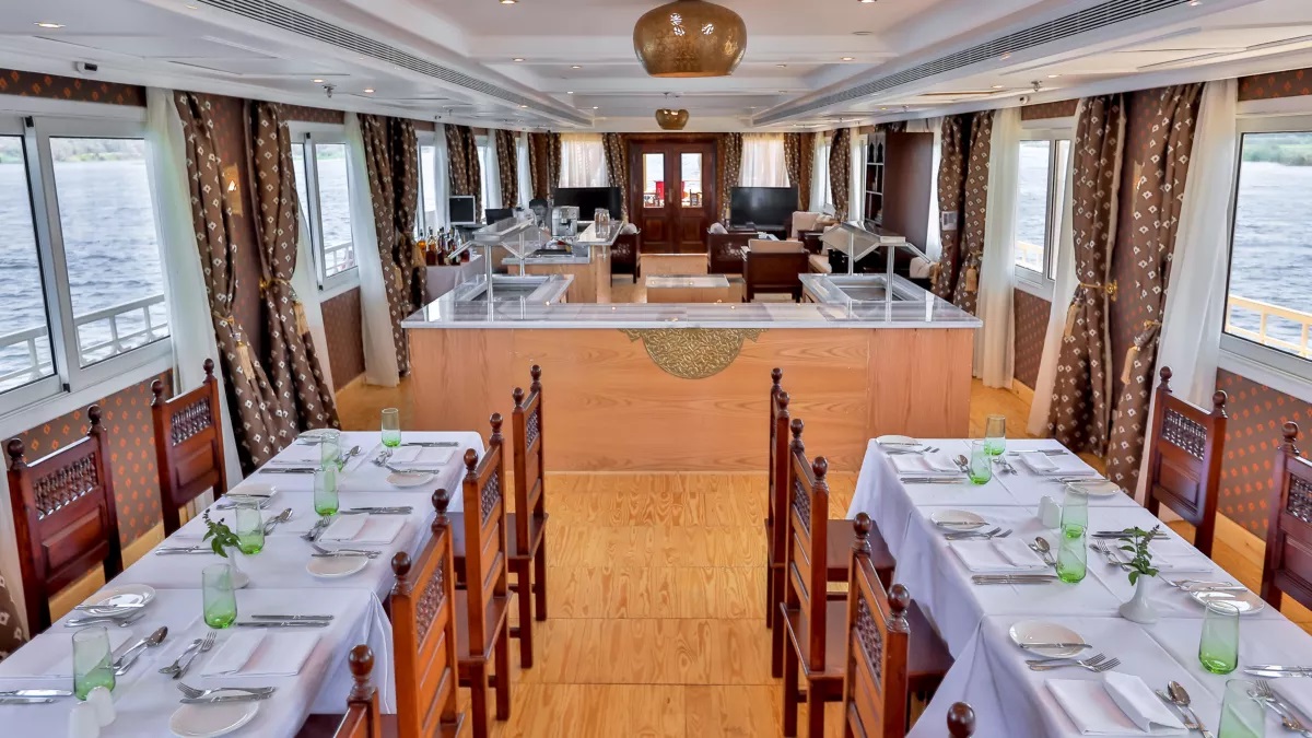 The boat offers eight tastefully decorated and fully air conditioned cabins. Each cabin is measuring 14 sqm, has a large bed or twin beds with Egyptian cotton bedding, a phone, an ample wardrobe, and a large window, where from guests can enjoy a great view of the Nile in the privacy of their room. The private bathrooms are all equipped with shower, bathtub, toilet, washing basin and hairdryer.