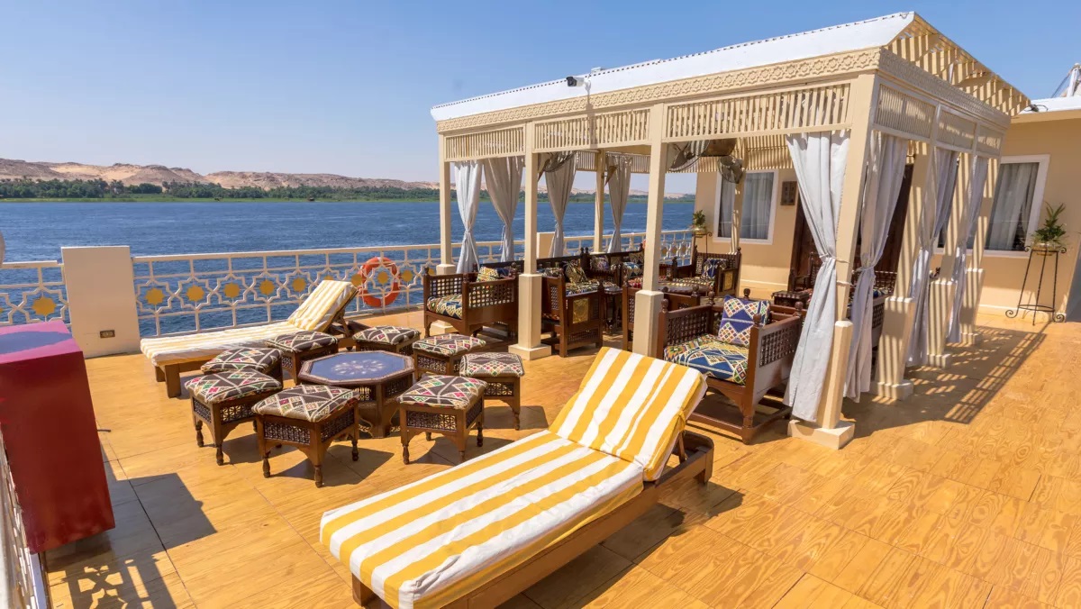 The fully air-conditioned suite has all of the luxury fittings of the cabins, but in a more spacious and sumptuous setting. It spans the full width of the rear of the boat and is measuring 23sqm, opening onto its own private terrace with a panoramic view of the Nile. There is a large bed with Egyptian cotton bedding, a phone and an ample wardrobe. The private bathroom is equipped with shower, bathtub, toilet, washing basin and hairdryer.