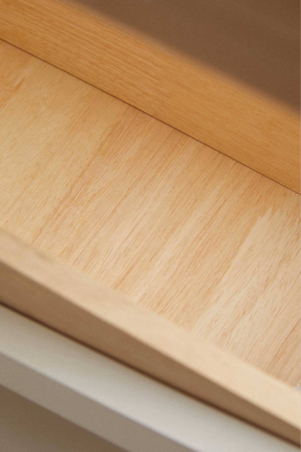 A storage unit made of natural wood for children with three levels of wooden shelves, white legs, and wooden dividers that can be removed to facilitate the storage process.